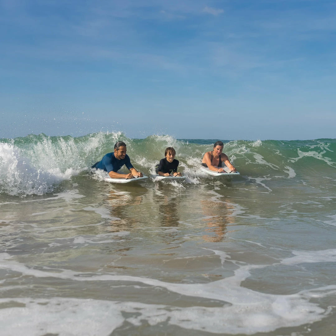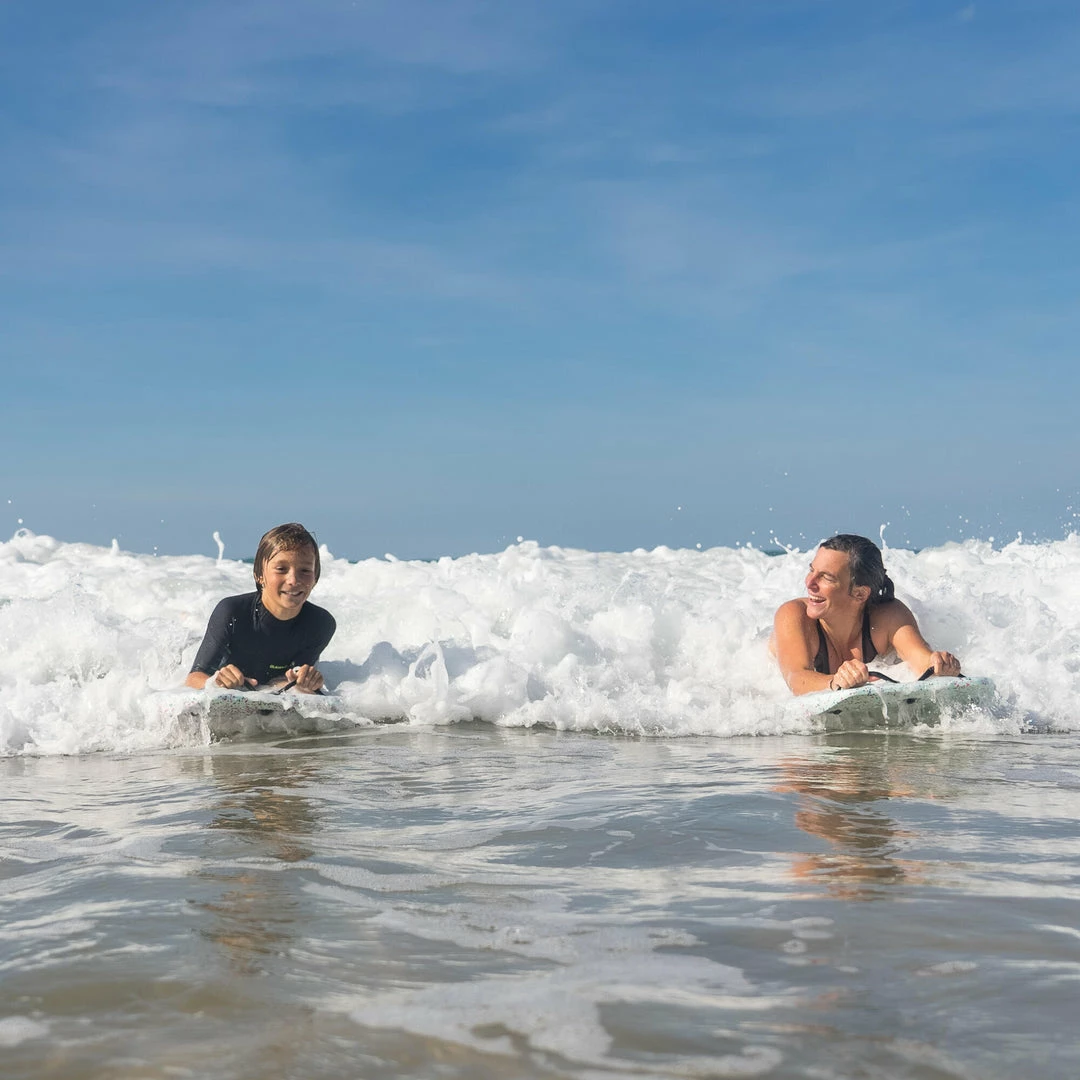 Bodyboard with handles allowing adults and kids to discover the joys of gliding on the waves on the beach. Top or shorty is obligatory.