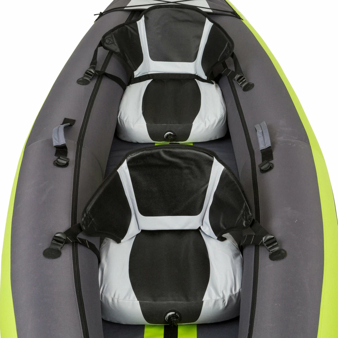 SOLD WITHOUT PUMP OR PADDLE. An inflatable kayak with 2 raised adult seats for good paddling comfort. Stable and reassuring.