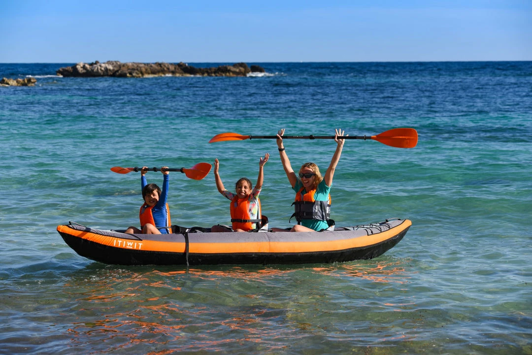 An inflatable kayak with 3 raised seats for good paddling comfort. Stable and reassuring, perfect for a family outing.