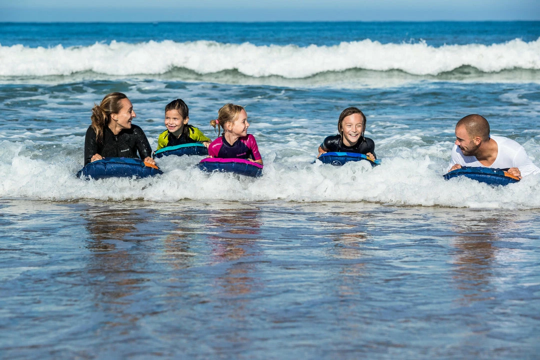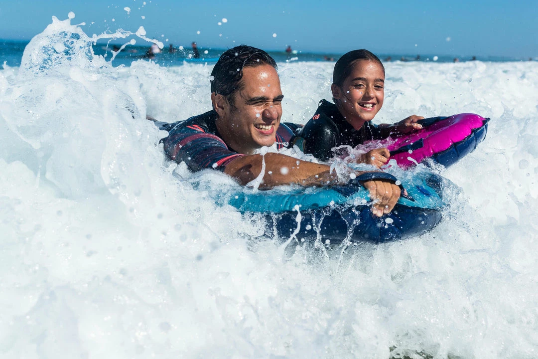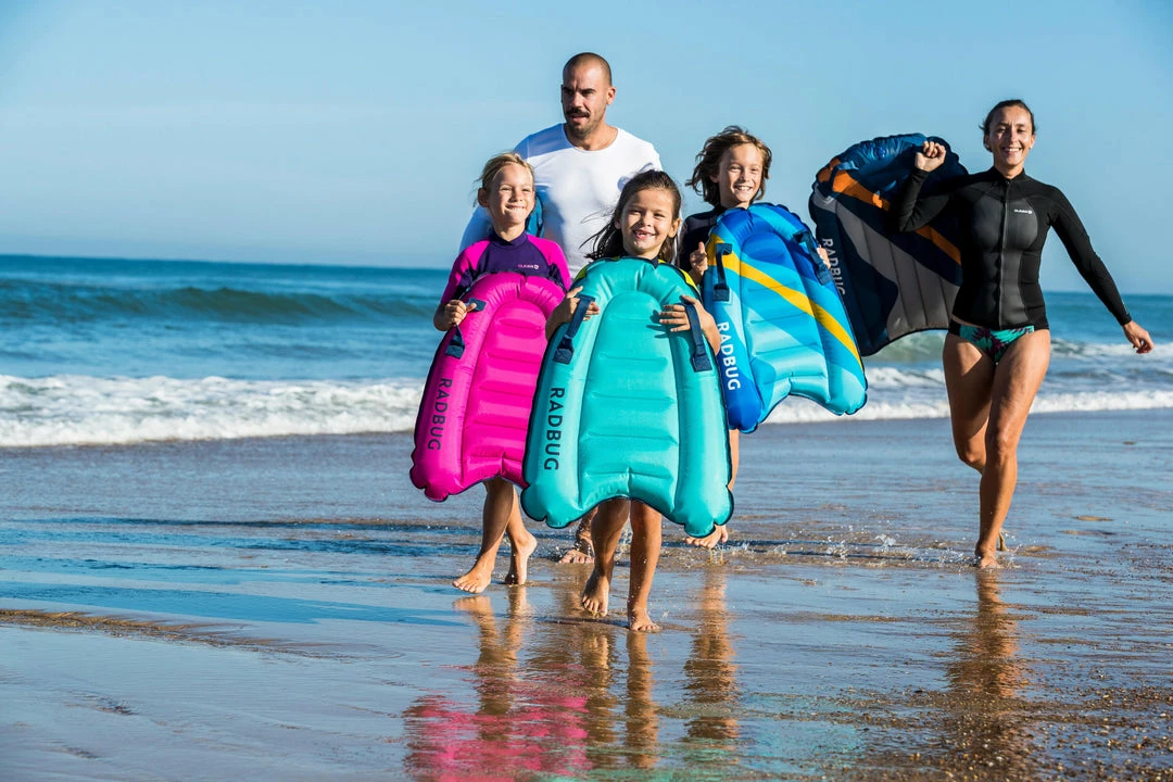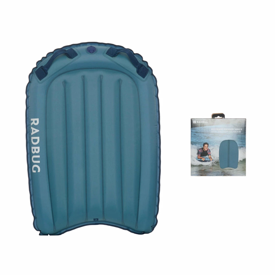 The Radbug Discovery is a medium-sized inflatable bodyboard that is designed for adults and kids alike. This bodyboard is best suited for individuals weighing at least 55 pounds and considering themselves beginner bodyboarders. The Radbug Discovery can be used on waves less than 40 in. in height. The board has an attached valve for easy inflation and deflation. There are two ergonomic grips and an additional leash can be purchased separately. The pre-shaped deck is designed with stability in mind and the board itself has a padded glide surface for optimal glide performance. Inflate the board by mouth with the push-button valve and avoid leaving the board out in the sun after use. Take care not to overinflate the board to prevent accidental popping.