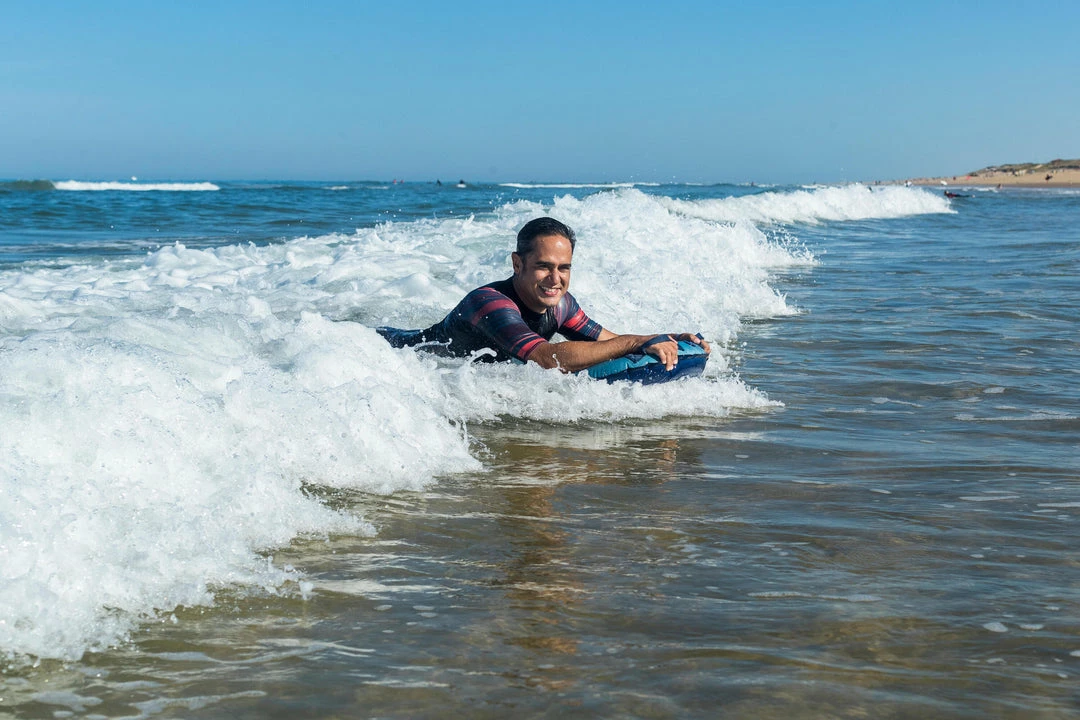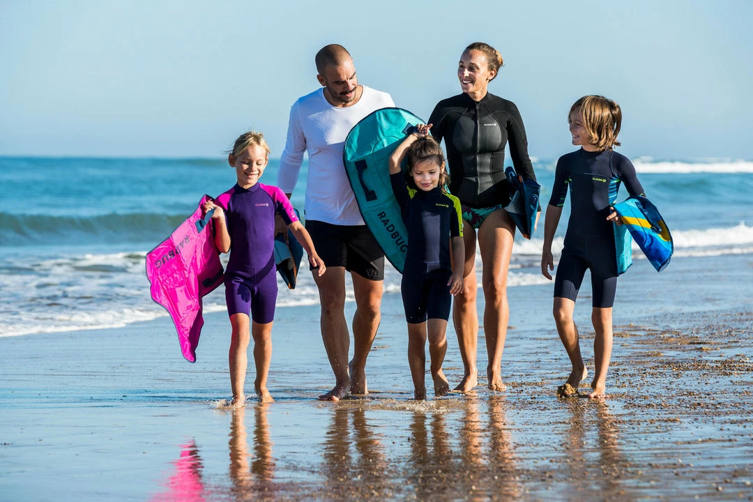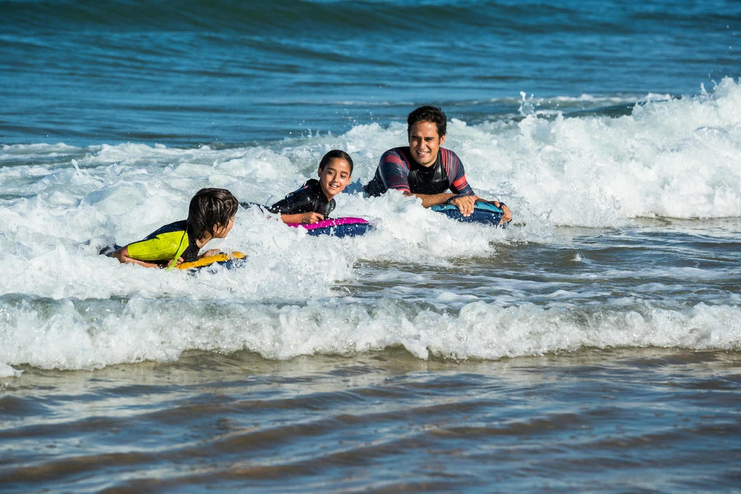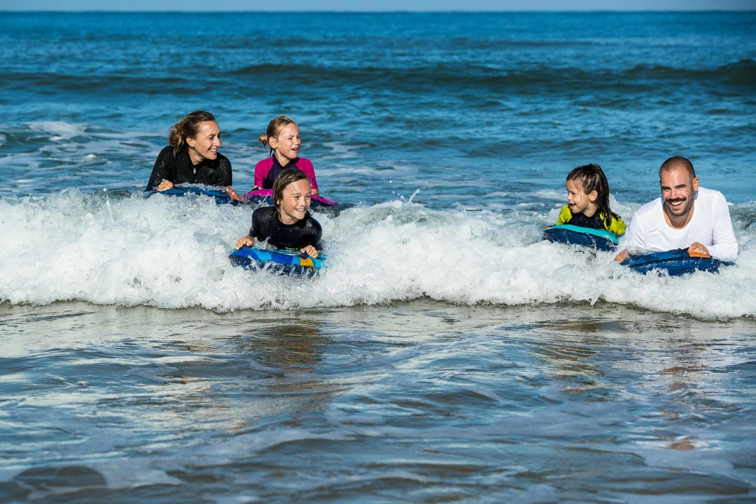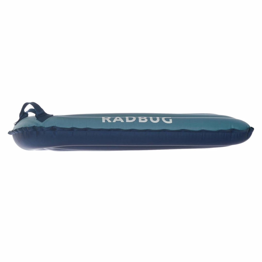 The Radbug Discovery is a medium-sized inflatable bodyboard that is designed for adults and kids alike. This bodyboard is best suited for individuals weighing at least 55 pounds and considering themselves beginner bodyboarders. The Radbug Discovery can be used on waves less than 40 in. in height. The board has an attached valve for easy inflation and deflation. There are two ergonomic grips and an additional leash can be purchased separately. The pre-shaped deck is designed with stability in mind and the board itself has a padded glide surface for optimal glide performance. Inflate the board by mouth with the push-button valve and avoid leaving the board out in the sun after use. Take care not to overinflate the board to prevent accidental popping.