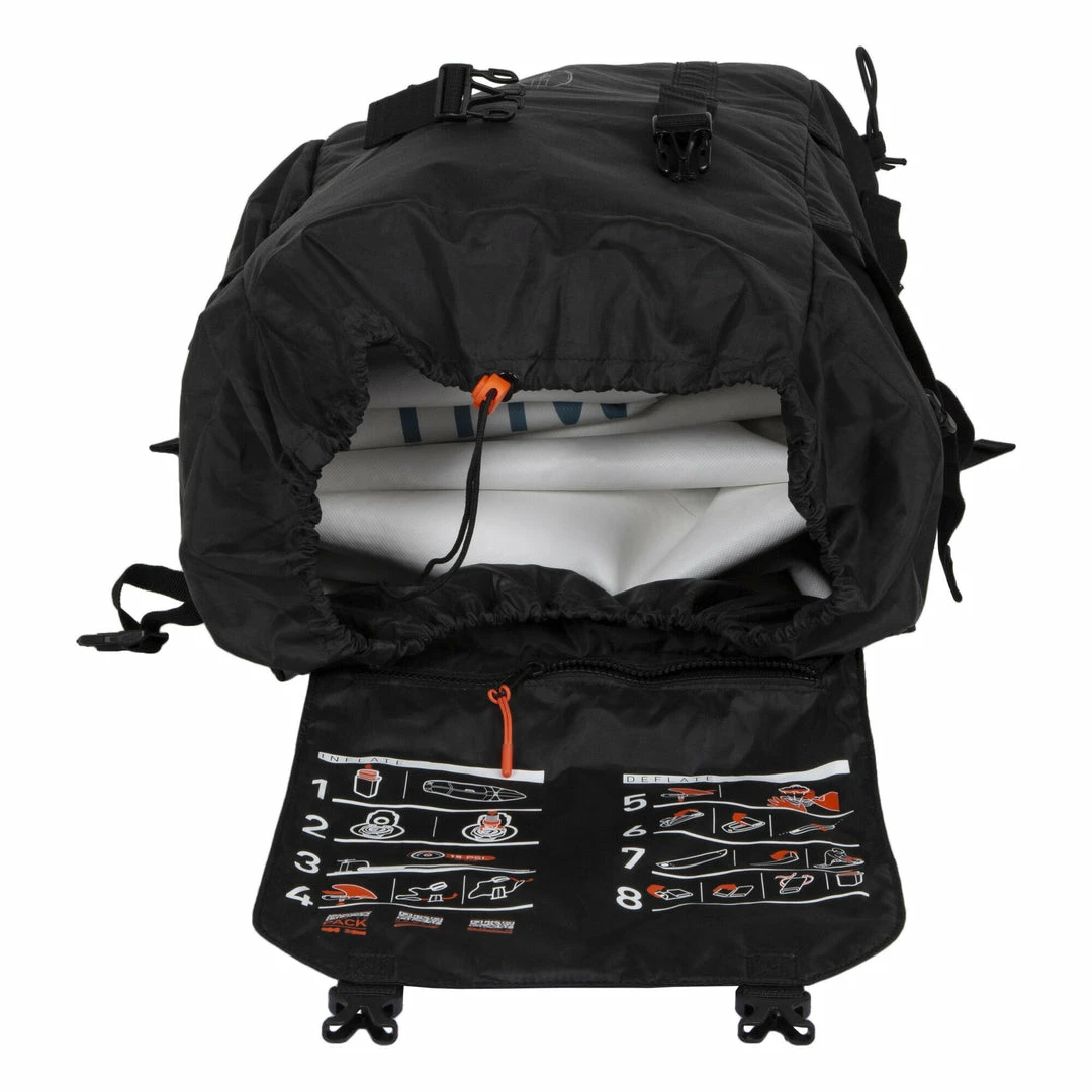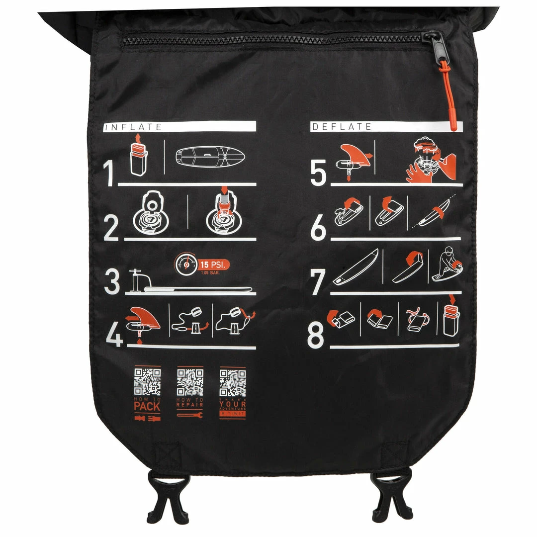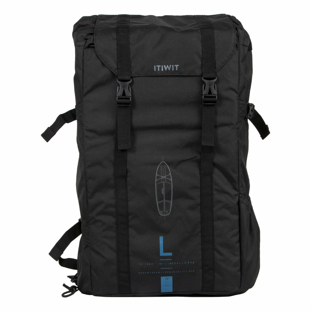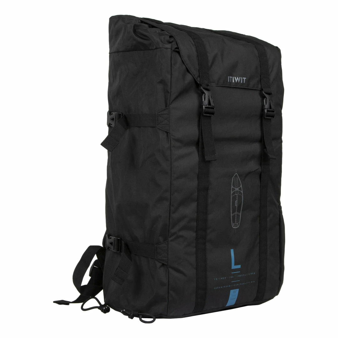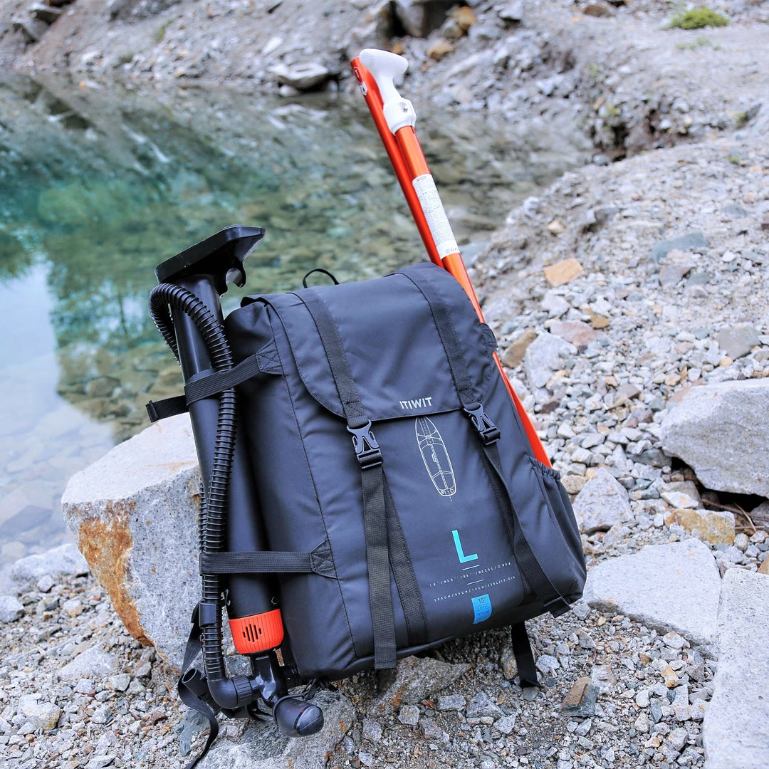 Approx. 30Β L carry bag with space for a pump and paddle on the outside.