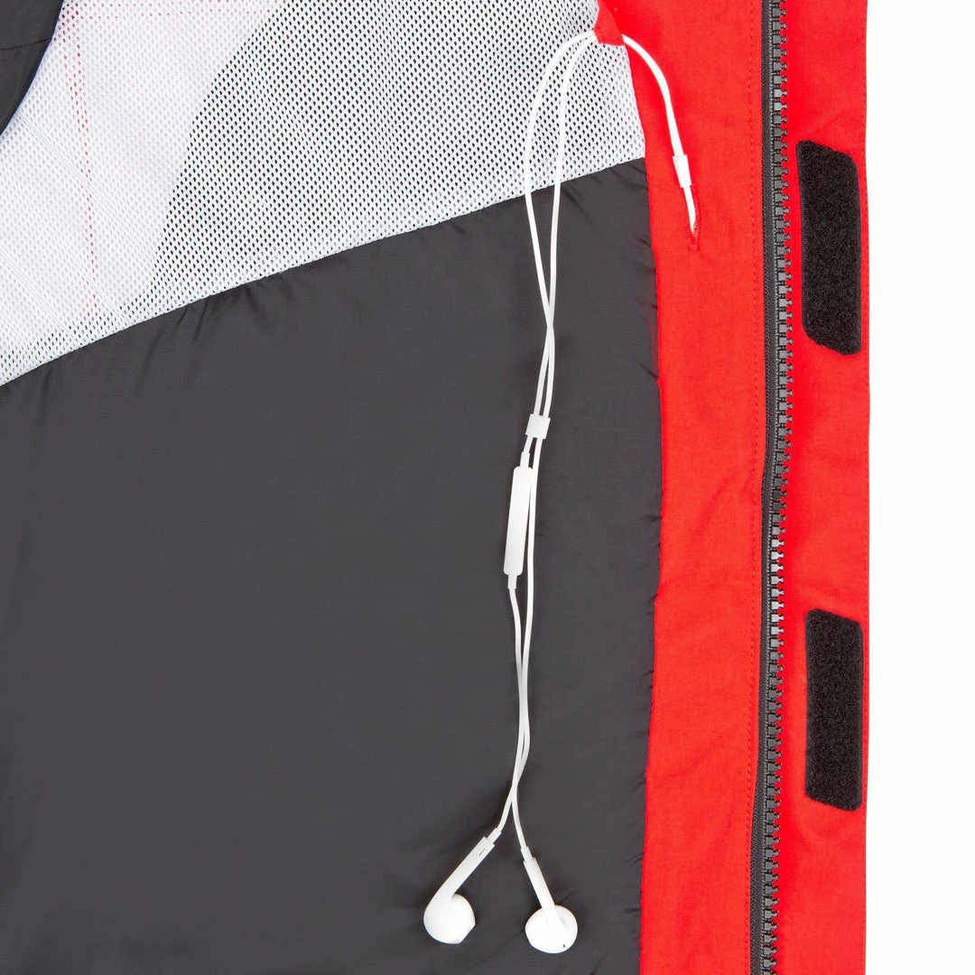 The jacket has an inner zippered waterproof pocket built into the central opening flap, which can be accessed even when the jacket is closed and has a hole for headphones.